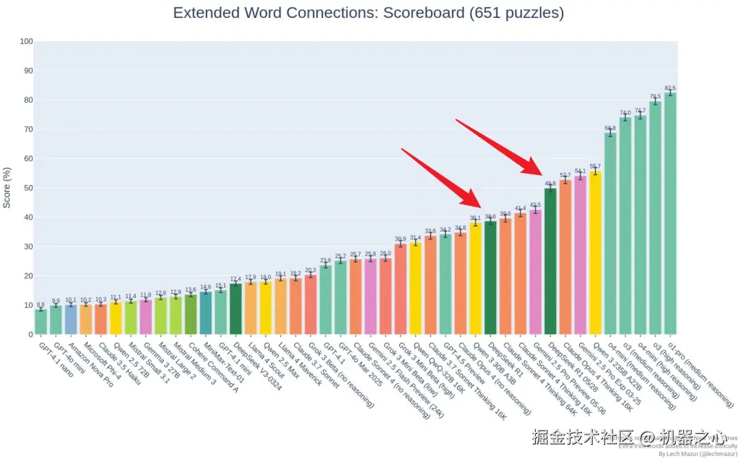 另外,其在 Extended NYT Connections 基准上的成绩也已经出炉,相比于前一代 DeepSeek-R1,最新的 0528 版本的提升非常明显,从 38.6 增至了 49.8,接近 Claude Opus 4 Thinking 16k;不过在该基准上,DeepSeek-R1-0528 仍旧没有挤进 OpenAI o 系列模型占据的第一梯队。