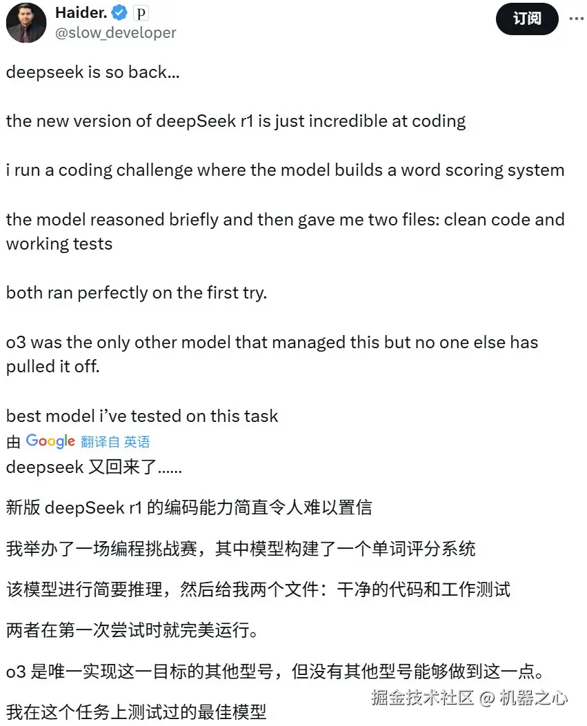 比如开发者 Haider 就通过一个编程挑战赛(构建一个词评分系统)挑战了当前主流的前沿模型,结果发现,目前只有 o3 和新版 DeepSeek-R1 能够完成这个挑战。这不禁让他感叹:DeepSeek is so back...