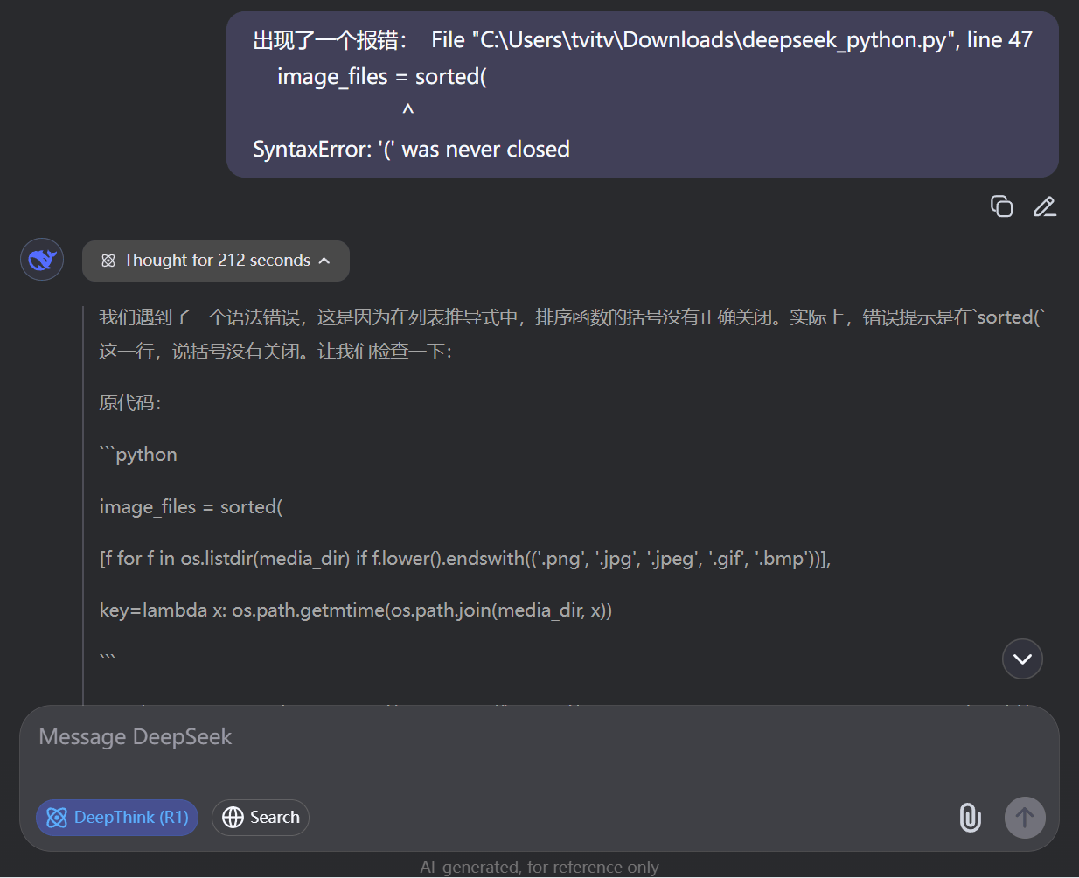 这是一个简单的句法错误,下面我们直接将其反馈给 R1-0528。结果出现了一个有趣的现象,对于这个简单报错,R1 模型思考的时间(212 秒)远远超过了之前写出整个程序的时间。
