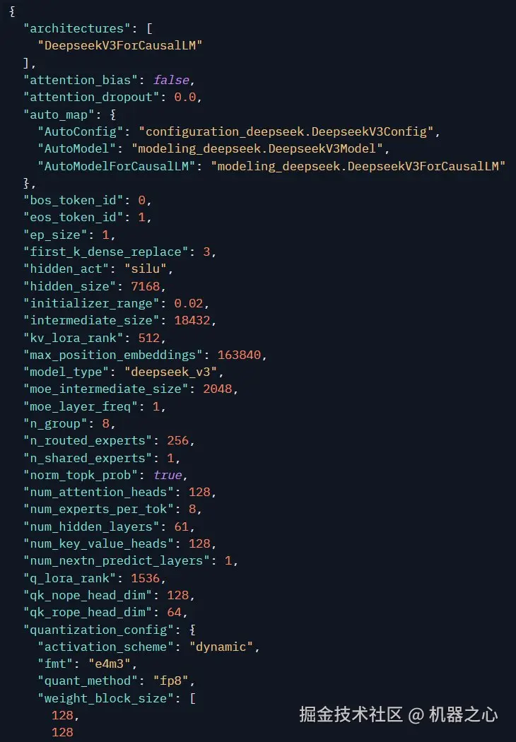 我们也能在新版 DeepSeek-R1 模型的配置文件中看到更多但并不出人意料的信息,包括采用了 DeepSeek-V3 作为基础模型以及 MoE、隐藏层大小、量化等配置。