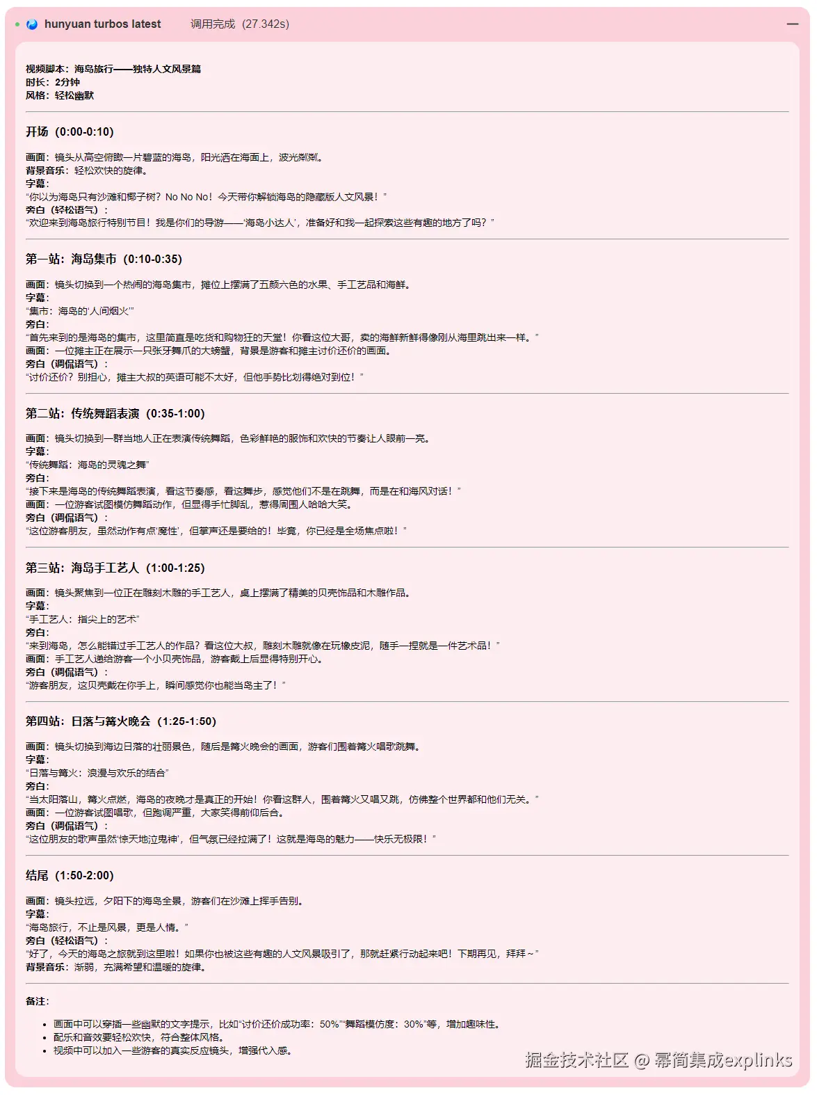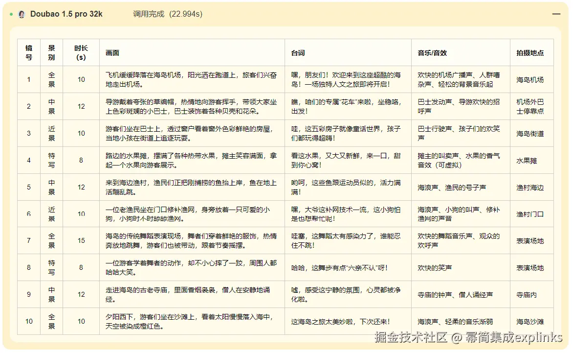 doubao-1.5-pro-32k最新一代专业版大模型,单价不提升的同时,模型能力有大幅提升。视频脚本生成效果如下: