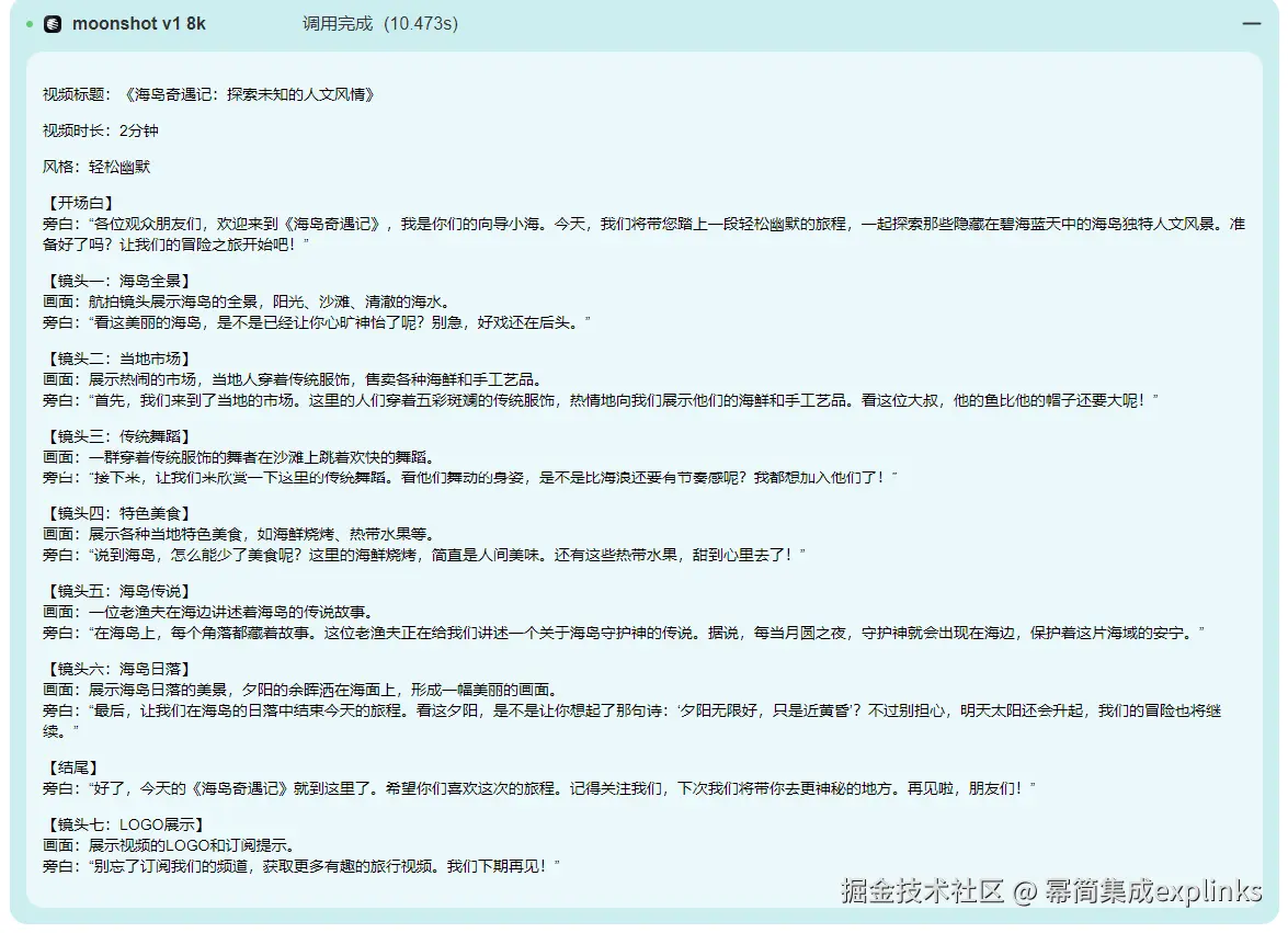 Moonshot-v1-8k是Moonshot AI推出的一款千亿参数的语言模型,支持8K上下文窗口,特别适合长文本的理解和内容生成场景。它具备优秀的语义理解、指令遵循和文本生成能力,能够根据用户输入生成相应的文本输出,广泛应用于内容创作、代码生成、文本摘要等领域。视频脚本生成效果如下: