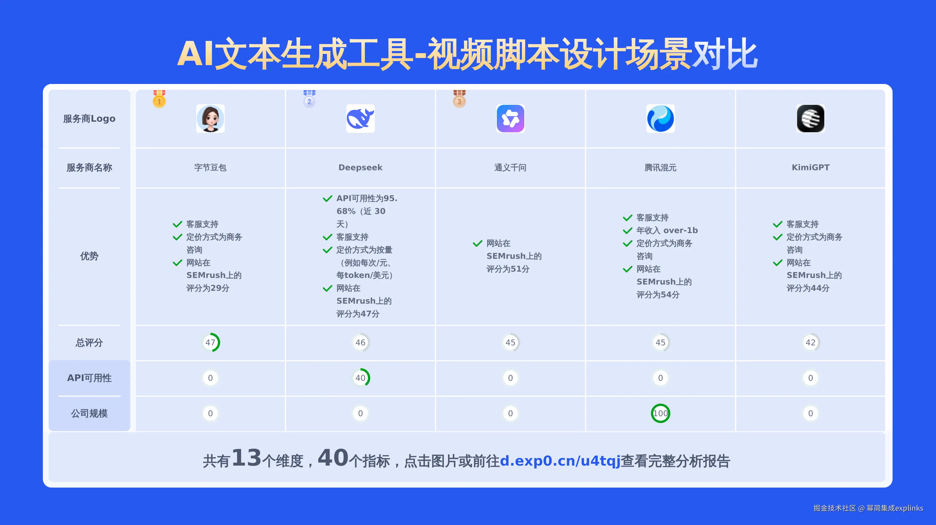 上面重点讲了5个服务商视频脚本生成的效果,从生成效果维度,我们首推字节豆包的AI视频脚本生成大模型。若要从价格、服务稳定性、互联网口碑等维度进行选型的话,请点此查看完整报告或可以自己选择期望的服务商制作比较报告