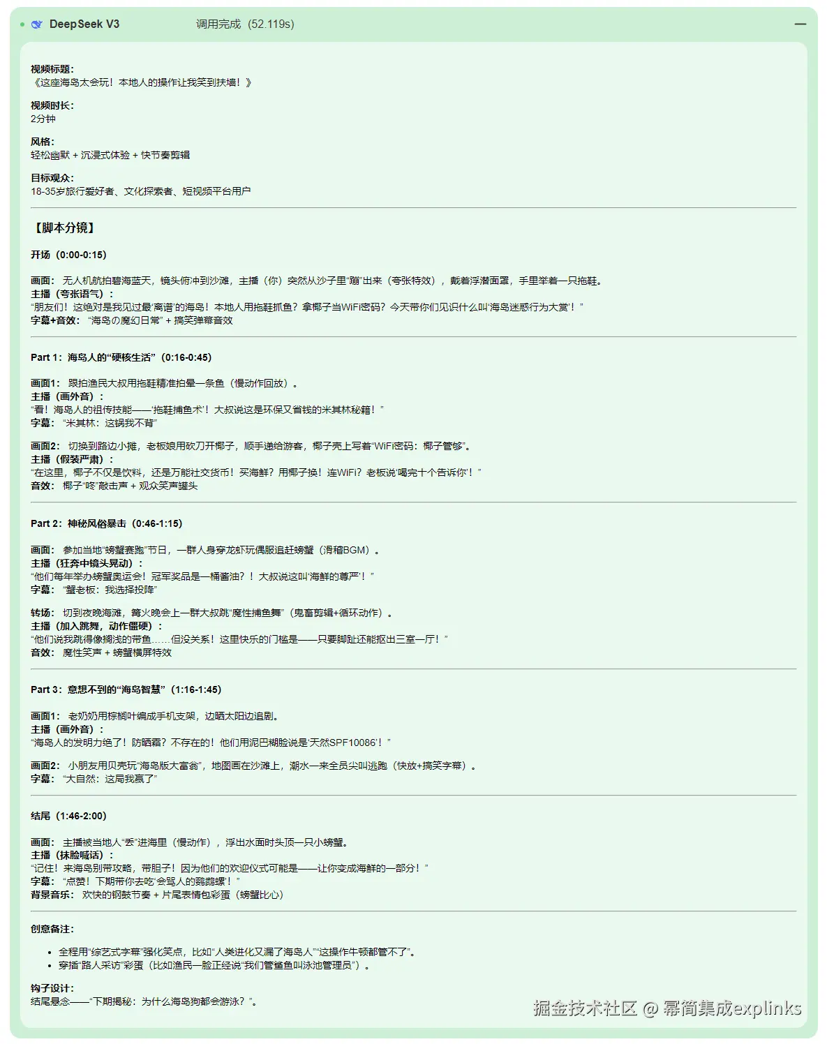 DeepSeek-V3 是由深度求索(DeepSeek)公司开发的一款先进的开源大语言模型,采用混合专家(MoE)架构,拥有 671B 总参数,其中每 token 激活 37B 参数。模型在 14.8 万亿高质量 token 上进行预训练,并通过监督微调和强化学习进一步优化。视频脚本生成效果如下: