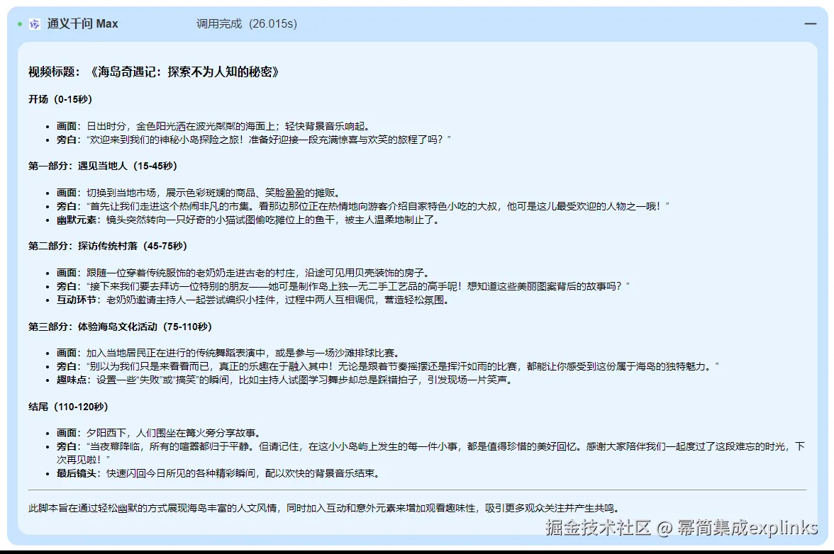 通义千问-Max 是阿里云通义千问系列中的旗舰大语言模型,专为复杂、多步骤任务设计。它基于混合专家(MoE)架构,拥有超过20万亿token的预训练数据,展现出强大的性能。通义千问-Max 在理解能力、逻辑推理、指令遵循和代码能力上表现优异,尤其在中文语境下,其文本理解、生成、知识问答和安全风险控制能力可媲美甚至超越部分国际领先模型。视频脚本生成效果如下: