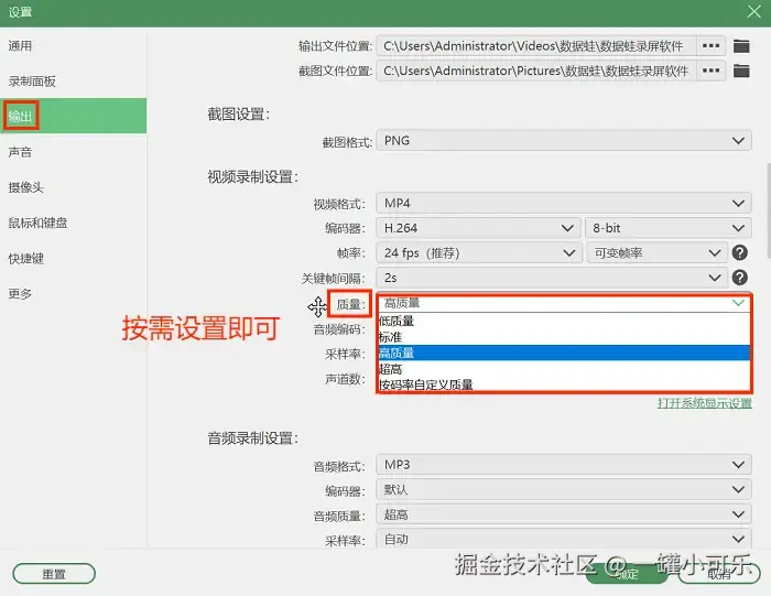 步骤2:选择好录制的区域以及音频源,还可以自定义视频的输出质量,我们可以在 【输出设置】 中调整视频的质量,开启 【超高质量】 录制。设置完毕后,点击 【REC】 就可以开始录制高清视频了。