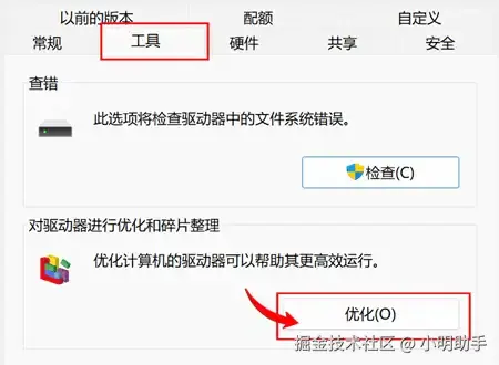 在【此电脑】里选中文件较多的磁盘,操作鼠标后按下右键点击【属性】,在上方选择【工具】,点击【优化】的按钮。