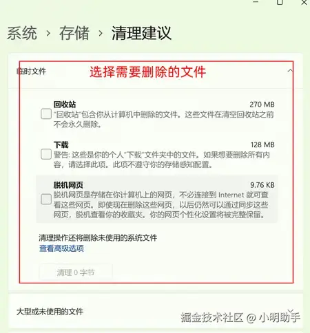 清理磁盘垃圾文件: 打开电脑【设置】,在左边列表中选择【存储】(或直接在搜索框中输入【清理建议】);在该页面找到【清理建议】,点进去就能看见系统为用户清理出来的垃圾文件,点击删除即可。