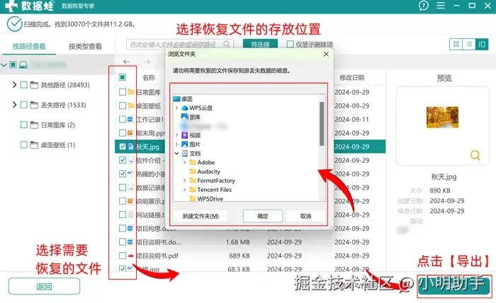 步骤2:等待扫描结束后,选择需要恢复的文件后点击【导出】,最后在弹窗为恢复文件选择新的存放位置。