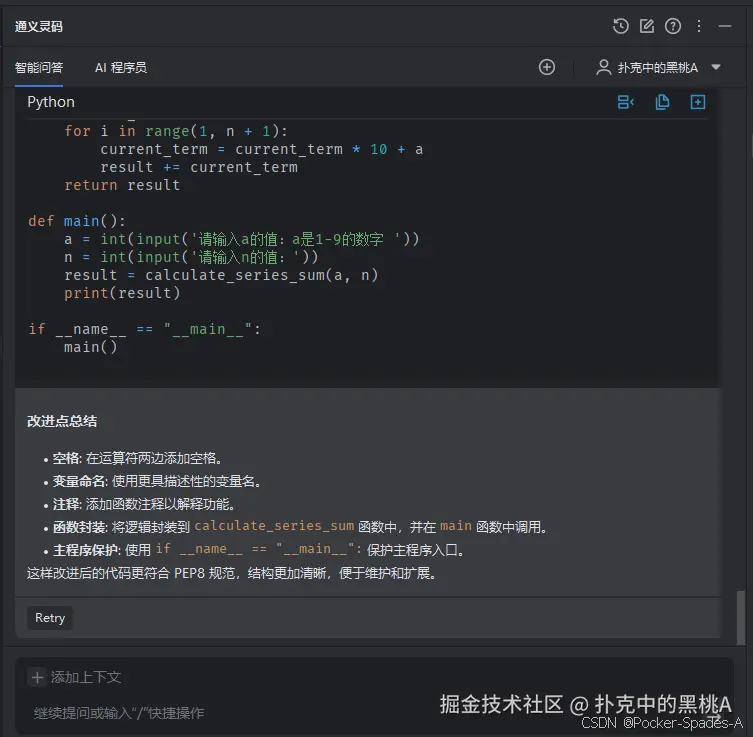 通义灵码还可以检查你的代码风格是否符合 Python 的最佳实践。例如,它可以检查你的代码是否遵循 PEP8 规范,是否有未使用的变量或导入的模块等。如果发现问题,通义灵码会给出相应的提示和建议,帮助你优化代码风格。