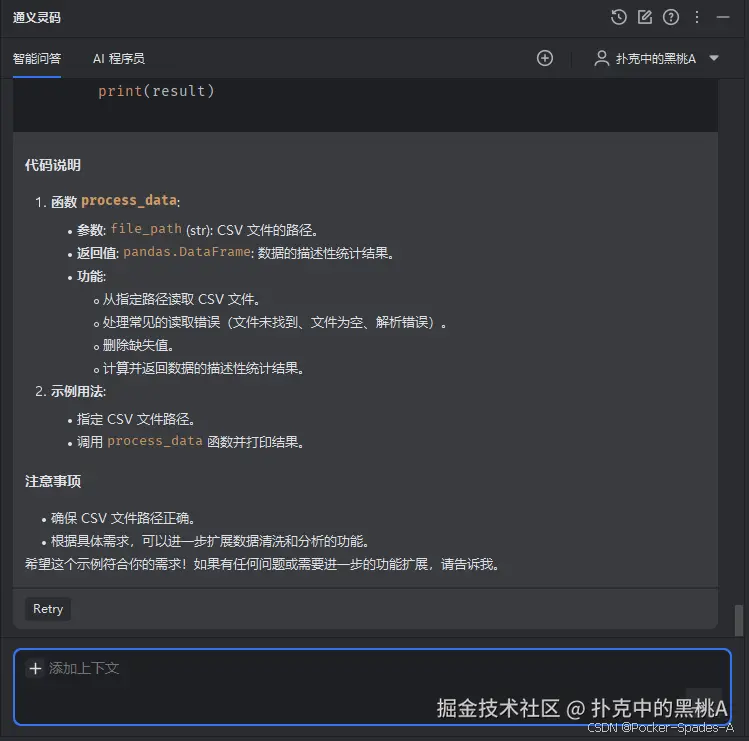 为了更好地展示通义灵码在 PyCharm 中的用处,我们来看一个实际的案例。假设我们正在开发一个 Python 项目,需要实现一个数据处理模块,该模块需要从一个 CSV 文件中读取数据,并进行一些数据清洗和分析操作。