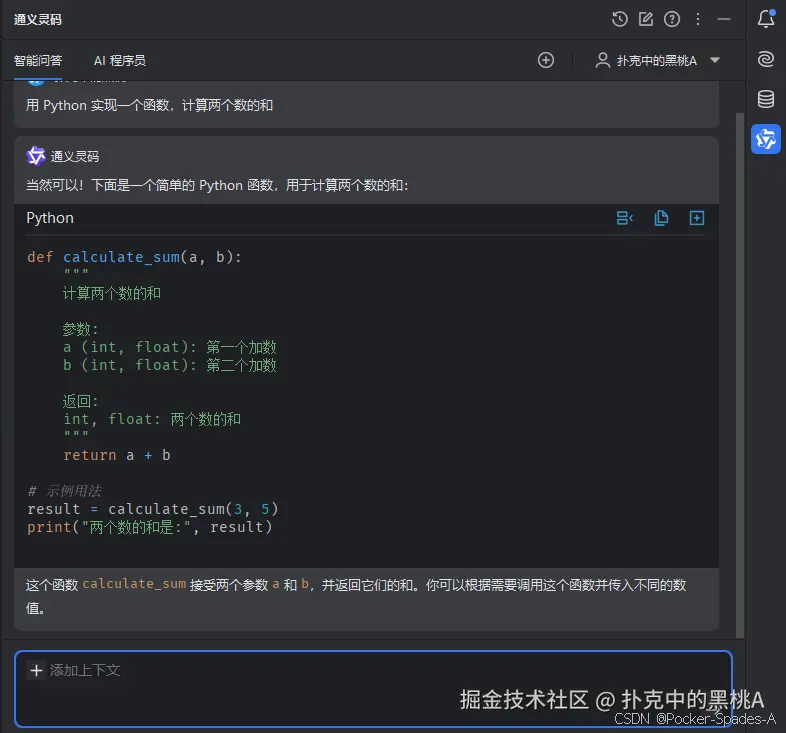在 PyCharm 中,使用通义灵码可以通过自然语言描述需求来生成代码片段。这种方式非常直观和便捷,让开发者可以更加专注于问题的解决,而不是花费大量时间在代码的编写上。 例如,如果你需要一个函数来计算两个数的和,可以在代码编辑区域中输入 “用 Python 实现一个函数,计算两个数的和”。通义灵码会根据你的描述生成相应的代码片段:
