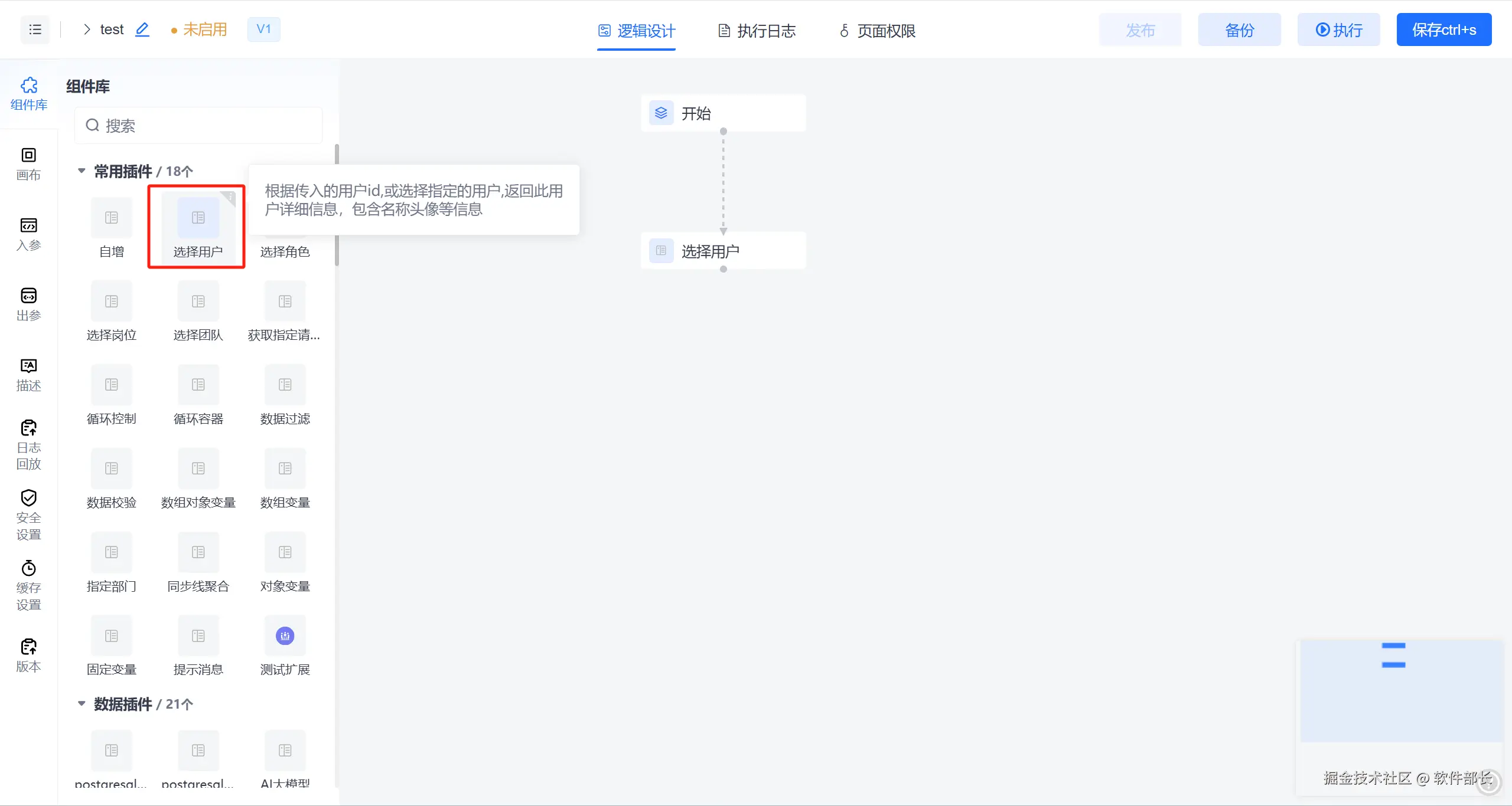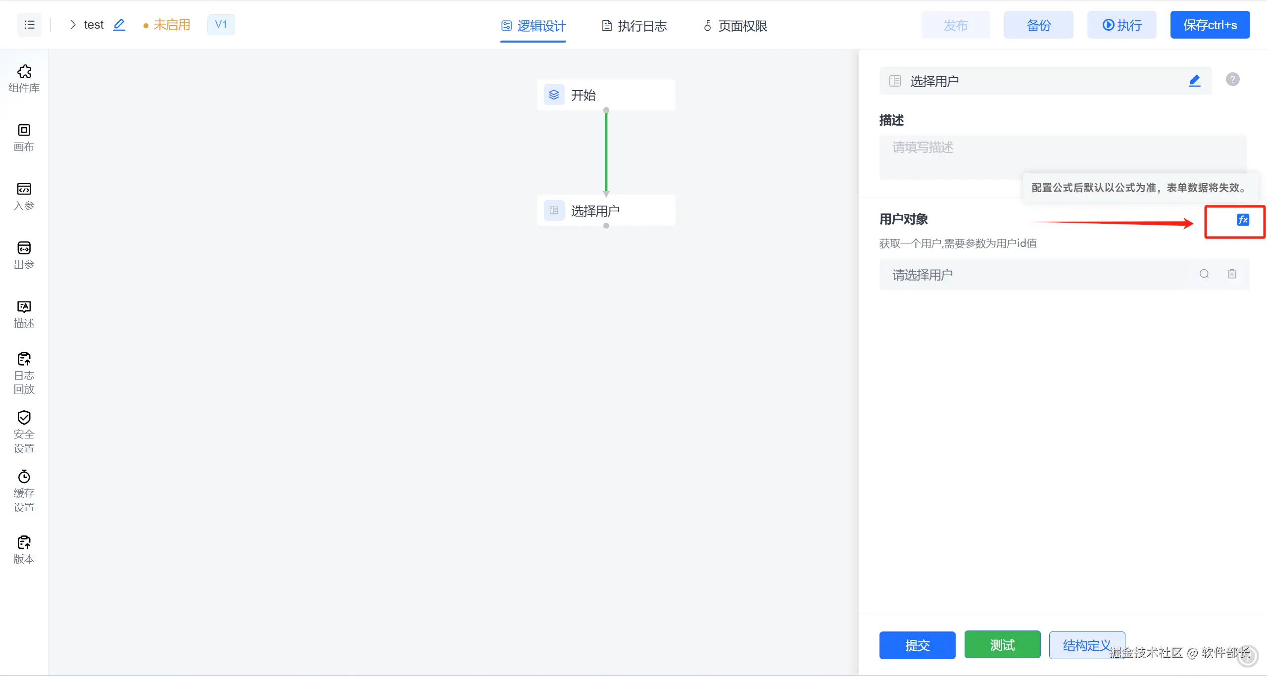 在逻辑引擎中有个【选择用户】核心组件,它可以通过预设公式自动解析业务系统中的用户ID,也能在可视化画布中通过拖拽操作快速绑定用户选择器。