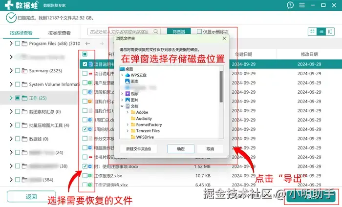 步骤2:等待软件显示“扫描完成”后,在显示扫描文件的列表中选择需要恢复的文件,点击“导出”后,在弹窗中选择恢复文件的存储位置。