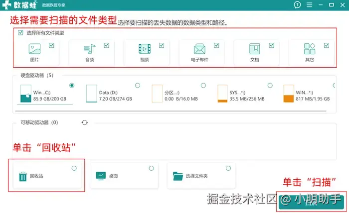 步骤1:打开数据 蛙恢复专家,在首页可以选择需要恢复的文件类型和扫描位置(此处选择“回收站”),点击“扫描”;