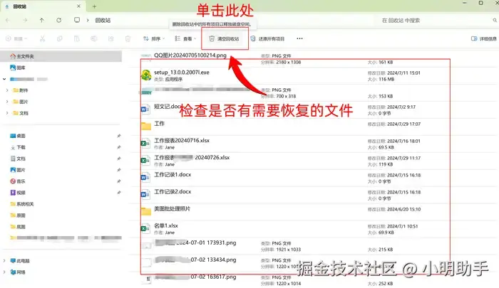 在电脑桌面上打开“回收站”,检查是否全部文件都需删除后,直接点击上方的“清空回收站”。