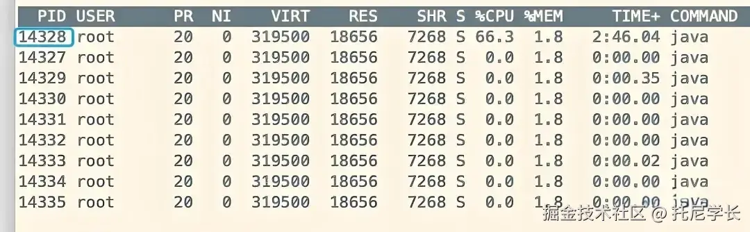 (2)继续通过top命令定位出消耗CPU最高的线程