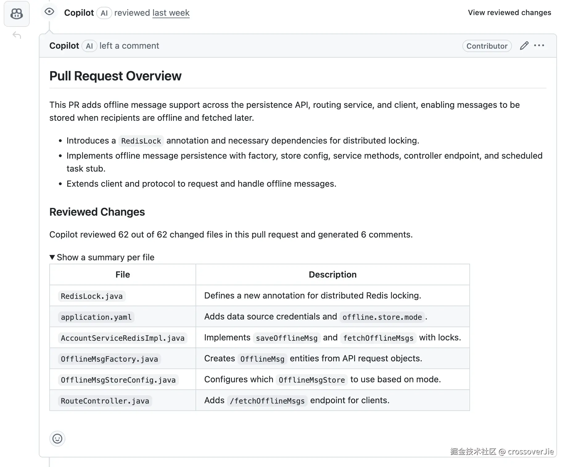 现在 Github 已经支持 copilot 自动 Review 了,它可以帮我们总结变更,同时对一些参加的错误提供修改建议。