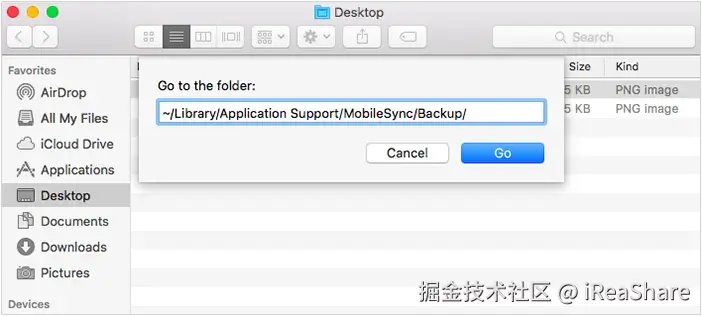 步骤 5: 备份完成后,您需要在 Mac 上找到备份文件夹。默认位置通常为:~/Library/Application Support/MobileSync/Backup/。请打开Finder,单击菜单栏中的“前往”,选择“前往文件夹... ”,然后粘贴此路径。