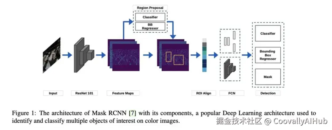 Mask RCNN(基于掩码区域的卷积神经网络)是一种流行的深度学习模型,用于实例分割任务,可识别和划分图像中像素级的对象。它是 Faster R-CNN 架构的扩展,以能够同时预测图像中每个实例的对象边界框、类标签和像素级掩码而著称。图 1 显示了掩码 RCNN 的架构及其各个组件。我们使用 Mask RCNN 算法训练了 MRF 数据集的 70 幅图像(50 幅训练图像和 20 幅验证图像),以识别图像中不同的塑料物体,并获得激活图,从而确定算法重点关注的图像区域。