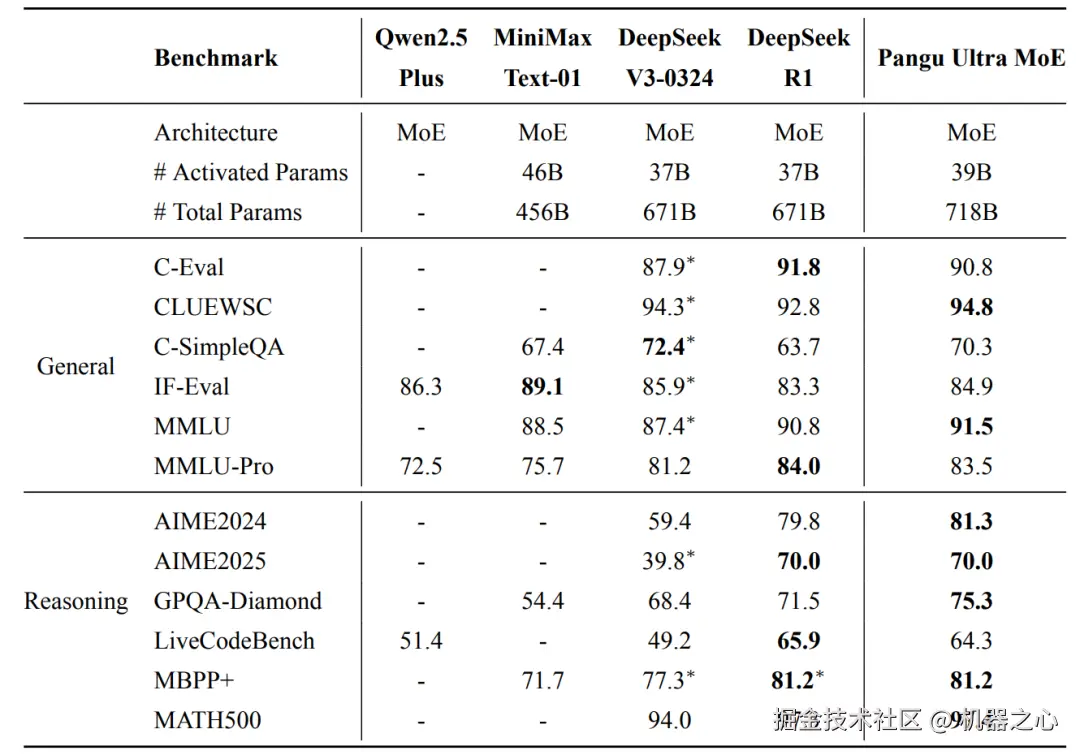 表 1: Pangu Ultra MoE 与目前主流模型效果对比
