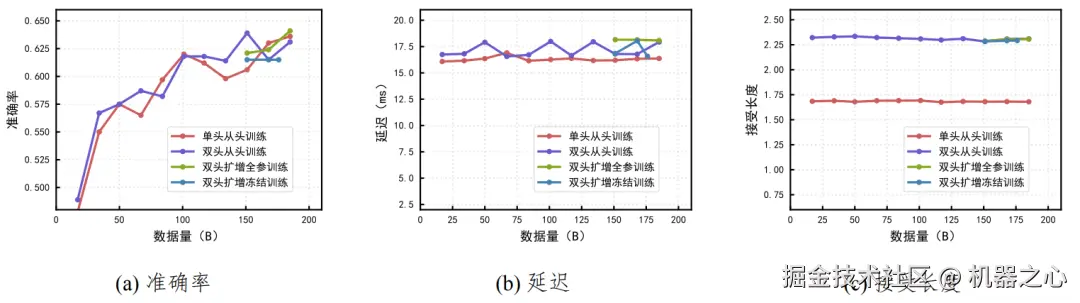 结果如图 3 所示。双头扩增模型的接受长度和延迟基本和双头从头训练一致,而双头的接受长度约 2.30,单头的接受长度约 1.67,双头相对单头提升约 38%。在模型效果方面,双头扩增模型全参训练和从零训练相当,而由于冻住了主干和一头,双头扩增冻结训练的精度在扩增的位置基本保持不变。这表明后期的 MTP 扩展可以达到多头的从头训练的投机推理效果,可以在模型训练早期保持较小的 MTP 配置并在后期再进行扩展,兼顾计算成本和推理能力。