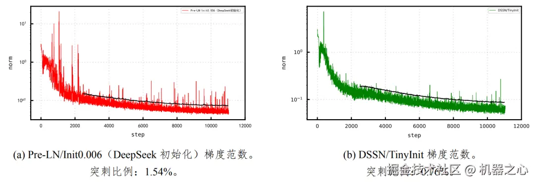 图 1: 训练过程的梯度范数对比图(黑色实线为突刺分界线)。DSSN+TinyInit 使梯度突刺率从 1.54% 下降到 0.76%,相对下降 51%。