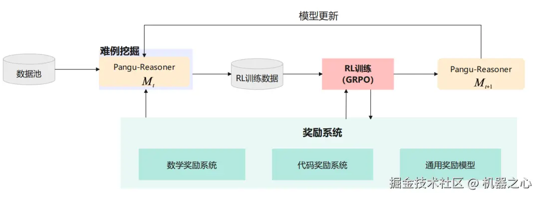 为了解决上述两个实践难题,盘古团队设计了 Pangu Ultra MoE 的强化学习训练系统,如图 4 所示,提升了大 MoE 模型的训练稳定性与推理性能。系统设计的关键在于两个部分:(1)迭代难例挖掘:模型阶段性更新后,从初始的数据池中进行多回复推理,选取回复通过率在 (0,1) 的数据组成 RL 训练数据池,以保持推理效率最大化;(2)多能力项奖励系统:为了确保模型多能力项协同提升,数学和代码均采用了基于规则的奖励,通用奖励模型则使用 LLM-as-a-judge 的方法对生成的回复质量进行评分,并对最终的 reward 进行归一化处理,保证了模型在多个能力项的综合表现。