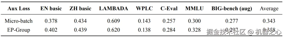 表 2: Micro-batch 和 EP-Group 的 auxiliary loss 效果比较