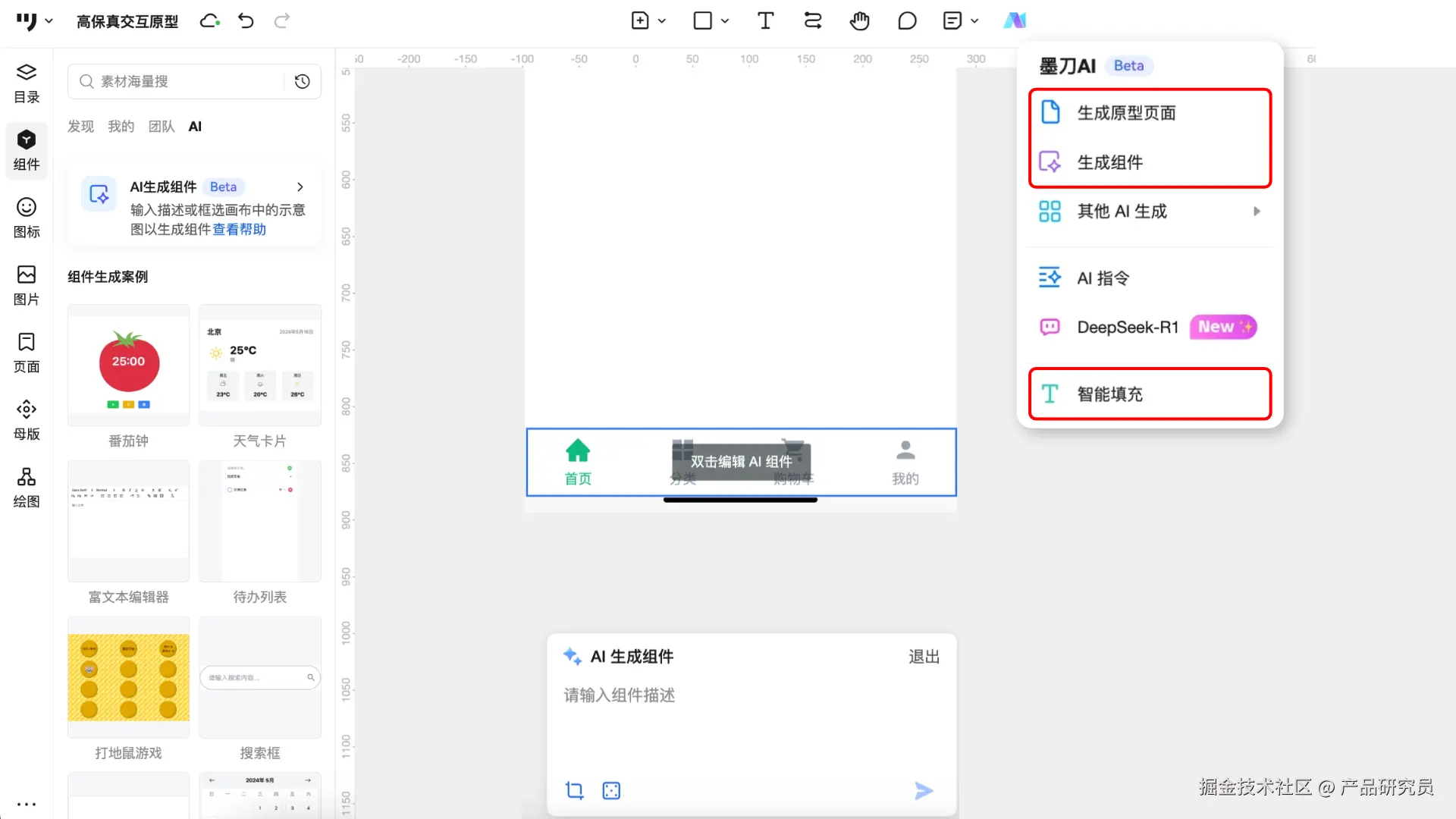 很多原型工具已经引入AI功能,帮助产品经理自动化生成原型结构。例如原型工具中的AI生成组件功能,AI秒速生成底部导航栏组件;针对页面中的图片、文案、数据字段等,AI可自动完成填充;还可以尝试针对常见的小程序/APP页面(如登录页、商品页),输入关键词即可秒出页面原型。