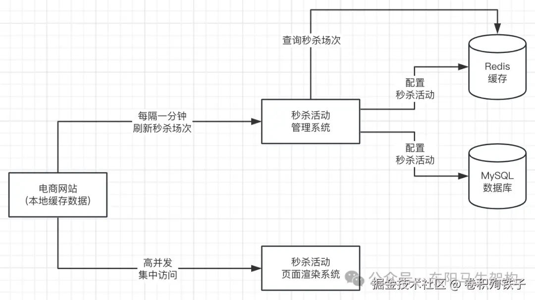 首先,秒杀活动的数据会存放在数据库里。然后,秒杀活动系统会对外提供一个接口,通过这个接口可以查询获取配置的秒杀场次和秒杀商品。一旦配置好秒杀活动的数据,之后一般不会随便变动。