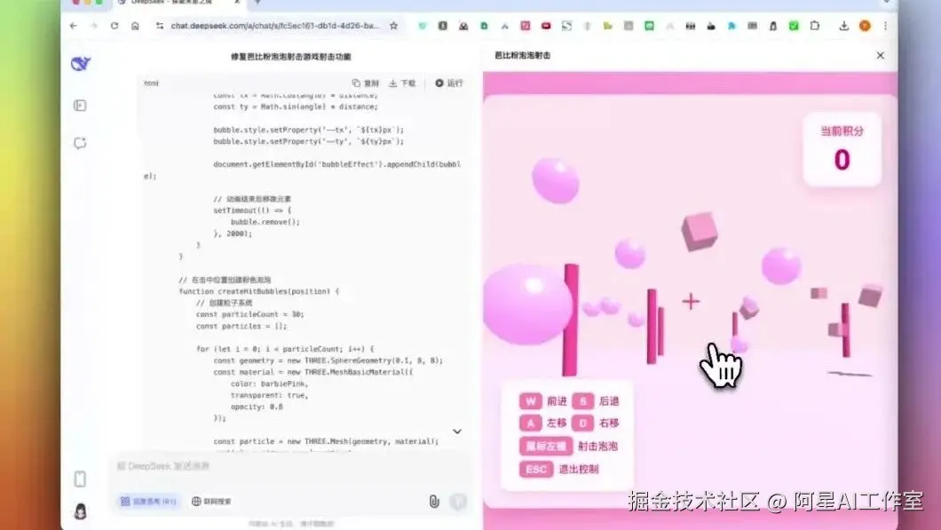 帮我做一个3d设计小游戏,芭比粉主体,每次射击的时候都会冒粉色泡泡。并且主体视角可以前进后退且可累计积分。