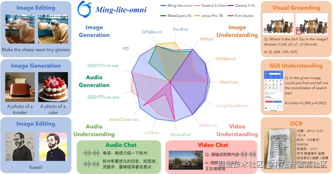 在多项理解和生成能力评测中,Ming-lite-omni 以仅 3B 的参数激活量, 性能与 10B 量级领先的多模态大模型相当或更优。官方表示,这也是目前已知首个在模态支持方面能够与 GPT-4o 相媲美的开源模型。