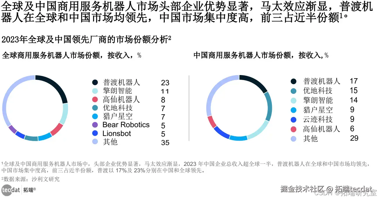 - 全球商用服务机器人市场:中国企业收入占比52%,普渡(23%)、猎户星空(12%)位列前二;