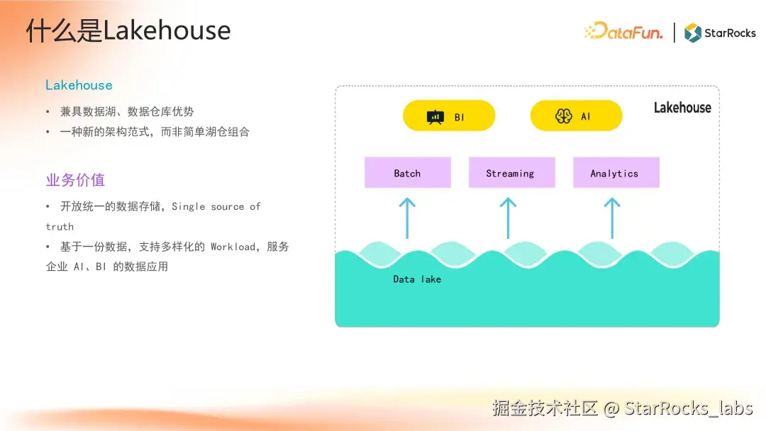 - 从数据新鲜度来看,Lakehouse 在数据入湖之后就可以查询,消除了同步延迟,可以保证数据的时效性。