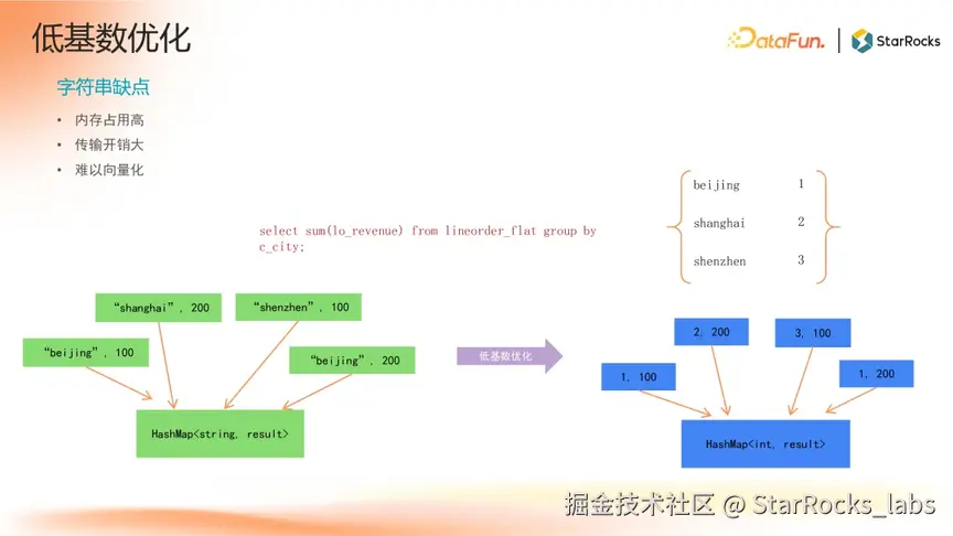 在实际数据中,用户往往存在大量字符串类型字段。相比基本整型数据,字符串处理存在内存占用高、传输开销大、难以向量化、匹配成本高等问题。为此,StarRocks 引入了低基数优化功能,通过预构建字典,将有限的字符串值转换为整数后处理,大幅提升字符串处理性能。