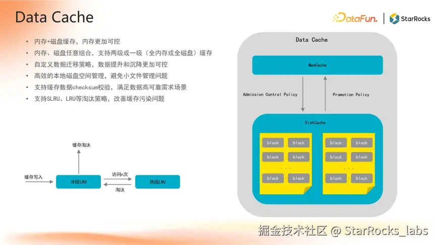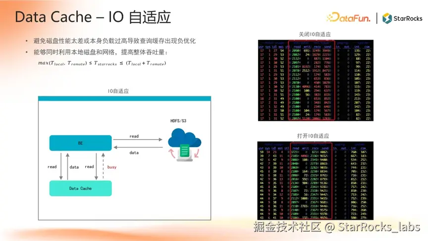 StarRocks 的 Data Cache 具备降本增效、提升稳定性等功能。它可减少对远端存储的访问,显著优化成本;利用本地内存和磁盘替代远端存储访问,提升 I/O 性能,还能减少性能抖动。