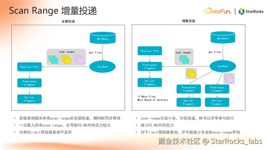 在 StarRocks 的查询流程中,FE 会将待访问的文件切分为多个 Scan Range,并投递至 BE 执行。早期版本采用全量同步投递机制,即 FE 的 Scan Node 需等待本次查询中所涉及到的所有 Scan Range 加载完成后一次性投递,此模式存在以下问题: