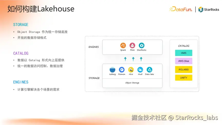 构建 Lakehouse 通常以低成本对象存储(如 S3、OSS)为统一存储底座,采用Iceberg、Hudi 等开放数据格式管理数据,以 Catalog 的形式向上层提供统一的数据访问控制和数据治理。上层整合 Spark、Flink、StarRocks 等计算引擎,可利用 Catalog 服务便捷地访问湖仓数据,实现“存储统一、计算灵活、治理可控”的湖仓一体架构。