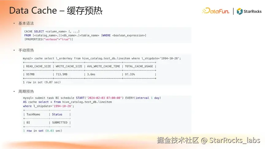 在查询过程中,StarRocks 除了在 cache miss 时会触发缓存填充外,还支持缓存主动预热功能,允许用户提前将所需数据缓存至本地。通过对 CACHE SELECT 语法进行深度性能优化,显著提升预热效率。在预热策略上,支持单次手动预热与周期性自动预热,满足不同场景下的数据预加载需求,进一步降低查询延迟,提升热点数据访问性能。