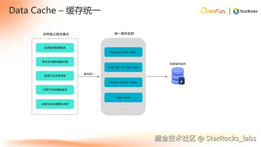 在多种内存与磁盘缓存并存的场景下,StarRocks 面临配置复杂、易引发 OOM 或磁盘空间耗尽、资源调度受限、代码复用困难,以及不同缓存策略冲突等挑战。为此,StarRocks 自研高效缓存组件,统一管理各类缓存实例,用户无需单独配置容量,系统可根据实时负载自动优化资源分配。