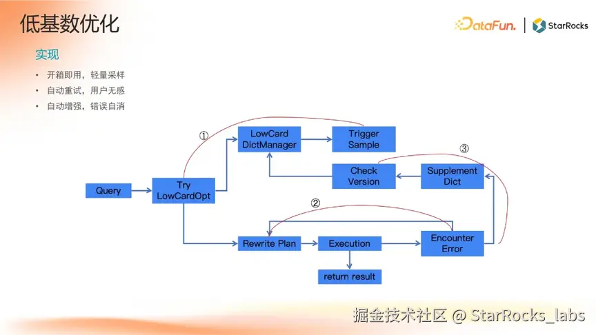 低基数优化的具体实现是通过轻量采样构建全局字典,此功能开箱即用。在执行过程中,若低基数优化执行失败,系统会自动重试,整个过程用户无感知。同时,系统会自动增强该模块的能力,以便下次能提供更优的匹配服务。