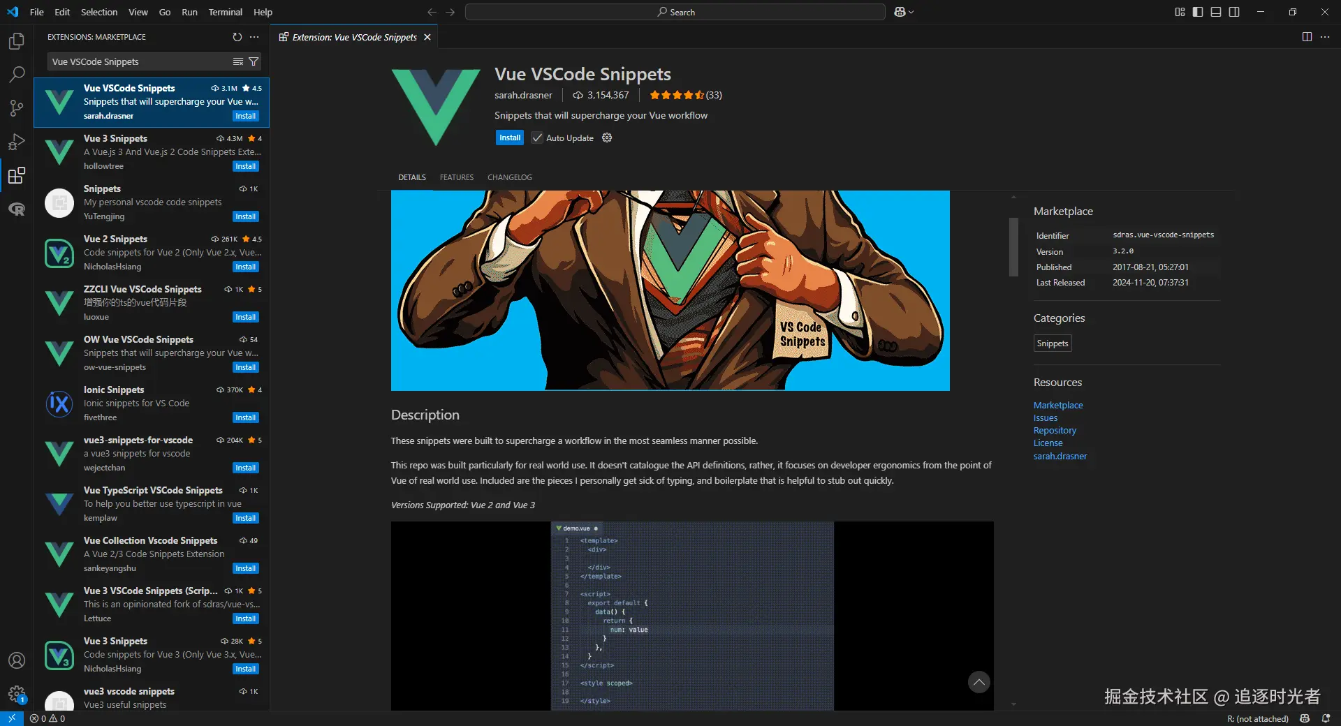 这个插件包含了所有的 Vue.js 2 和 Vue.js 3 的 api 对应的代码片段。插件的代码片段如下表格所示,你不需要记住什么snippets,就像往常一样在 vscode 里写代码就好了。比如你可以键入 vcom 然后按上下键选中 VueConfigOptionMergeStrategies 再按Enter键,就输入了Vue.config.optionMergeStrategies了。