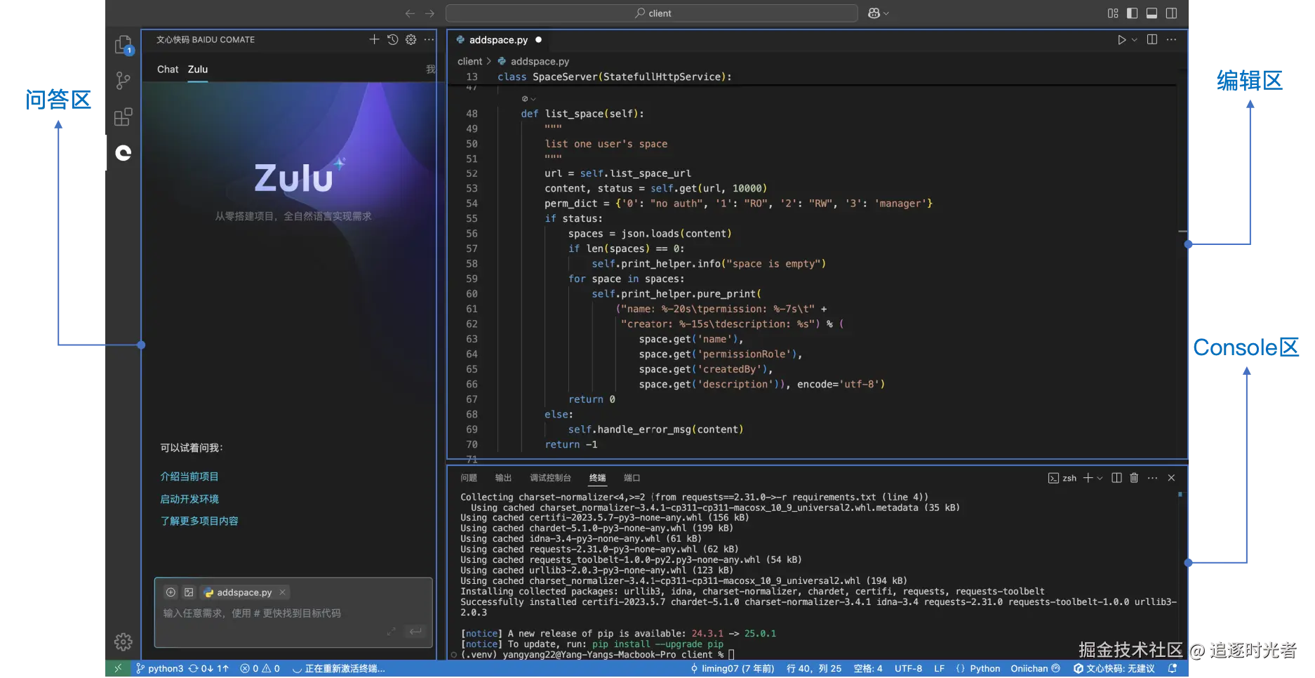 文心快码 ( Baidu Comate ) 是一款由百度推出的创新型 AI 编码辅助工具,它利用先进的人工智能技术,旨在为您带来前所未有的流畅、直观且上下文驱动的编码体验,助力开发者更轻松地实现宏大的软件项目和创新想法。安装后,它将成为您 IDE 的一部分,您无需切换工具,即可在熟悉的编码区专注于代码编写。同时,文心快码还在侧边栏提供了 Zulu 智能体等功能入口,您可以在侧边栏与 AI 进行更深度的交互,例如进行代码问答、探索 Zulu 的各项能力。