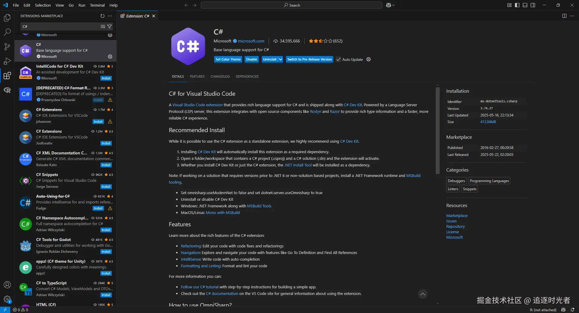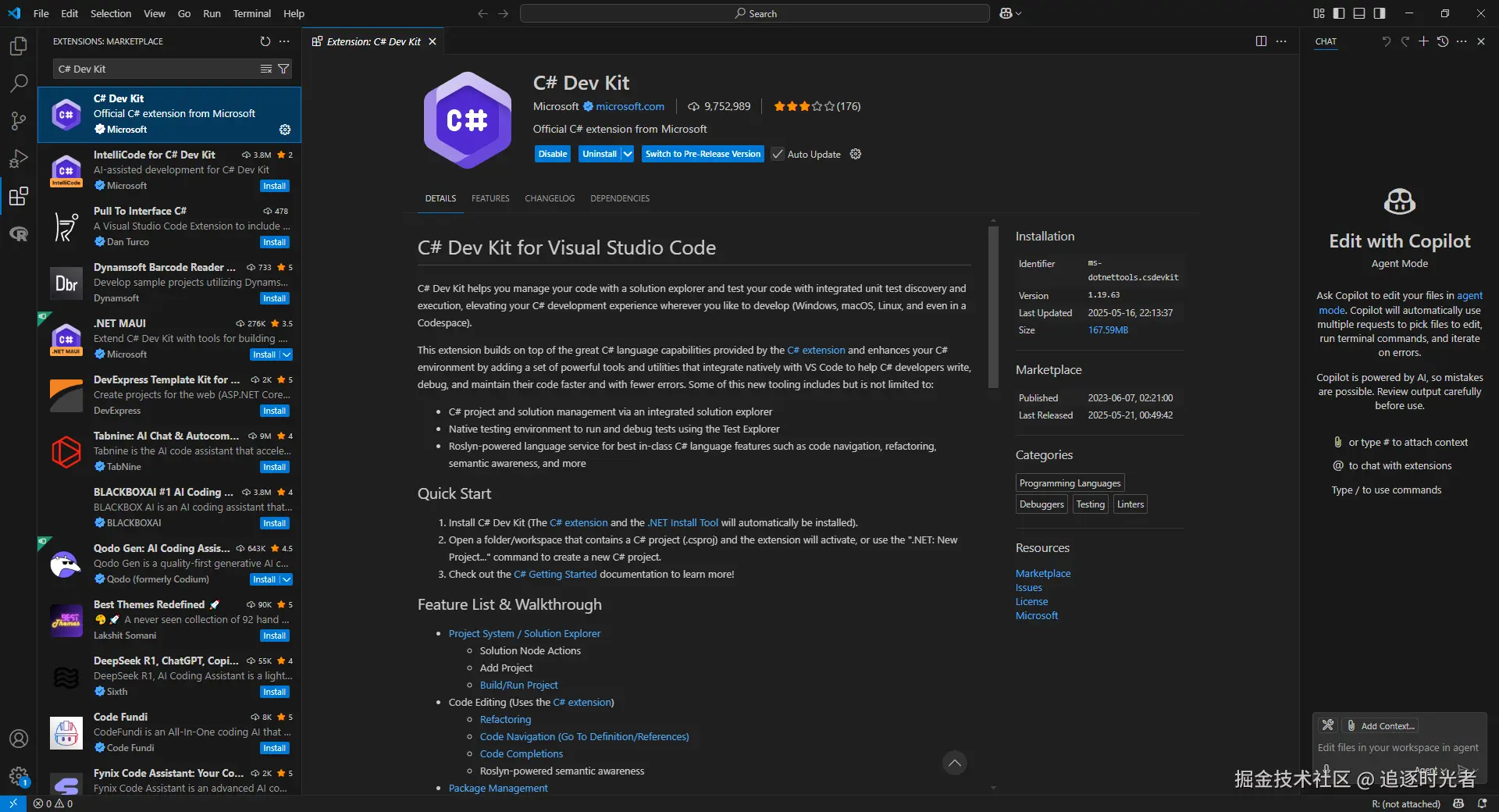 一个 Visual Studio Code扩展,为 C# 提供丰富的语言支持,并与 C# 开发工具包一起提供。此扩展由语言服务器协议 (LSP) 服务器提供支持,与 Roslyn 和 Razor 等开源组件集成,以提供丰富的类型信息和更快、更可靠的 C# 体验。
