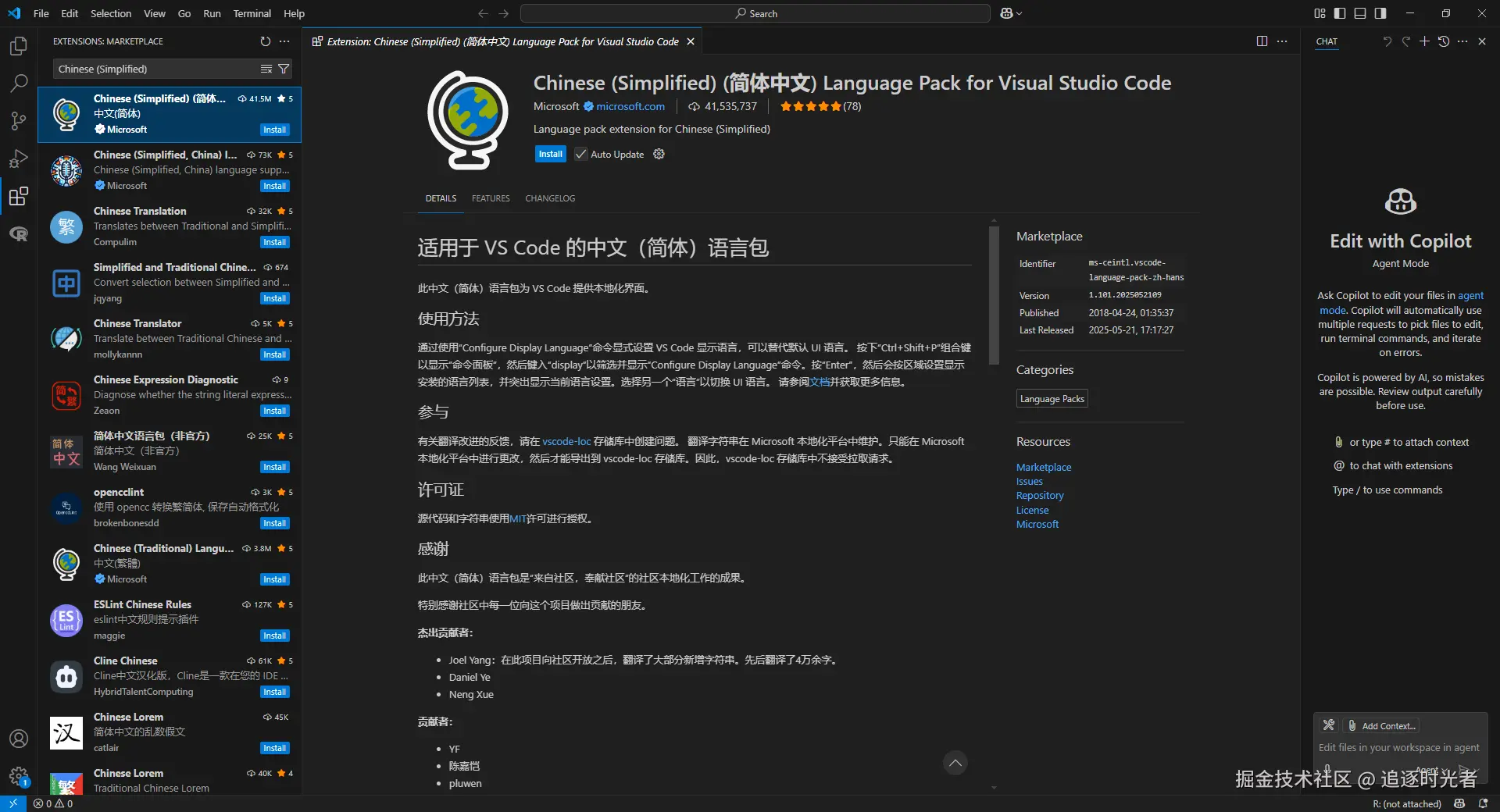 为 VS Code 提供简体中文的本地化用户界面体验。安装此语言包后,用户可以将VS Code的界面语言切换为中文(简体),从而更方便地使用这款编辑器。