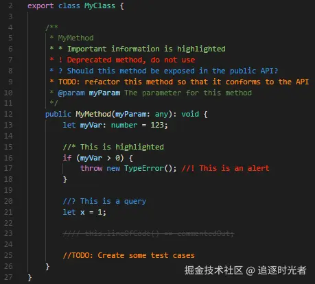 更好的注释扩展将帮助您在代码中创建更人性化的注释。使用此扩展,您将能够将注释分类为:警报、查询、待办事项、强调、注释掉的代码也可以设置样式,以使代码不应该存在、您可以在设置中指定任何其他注释样式。