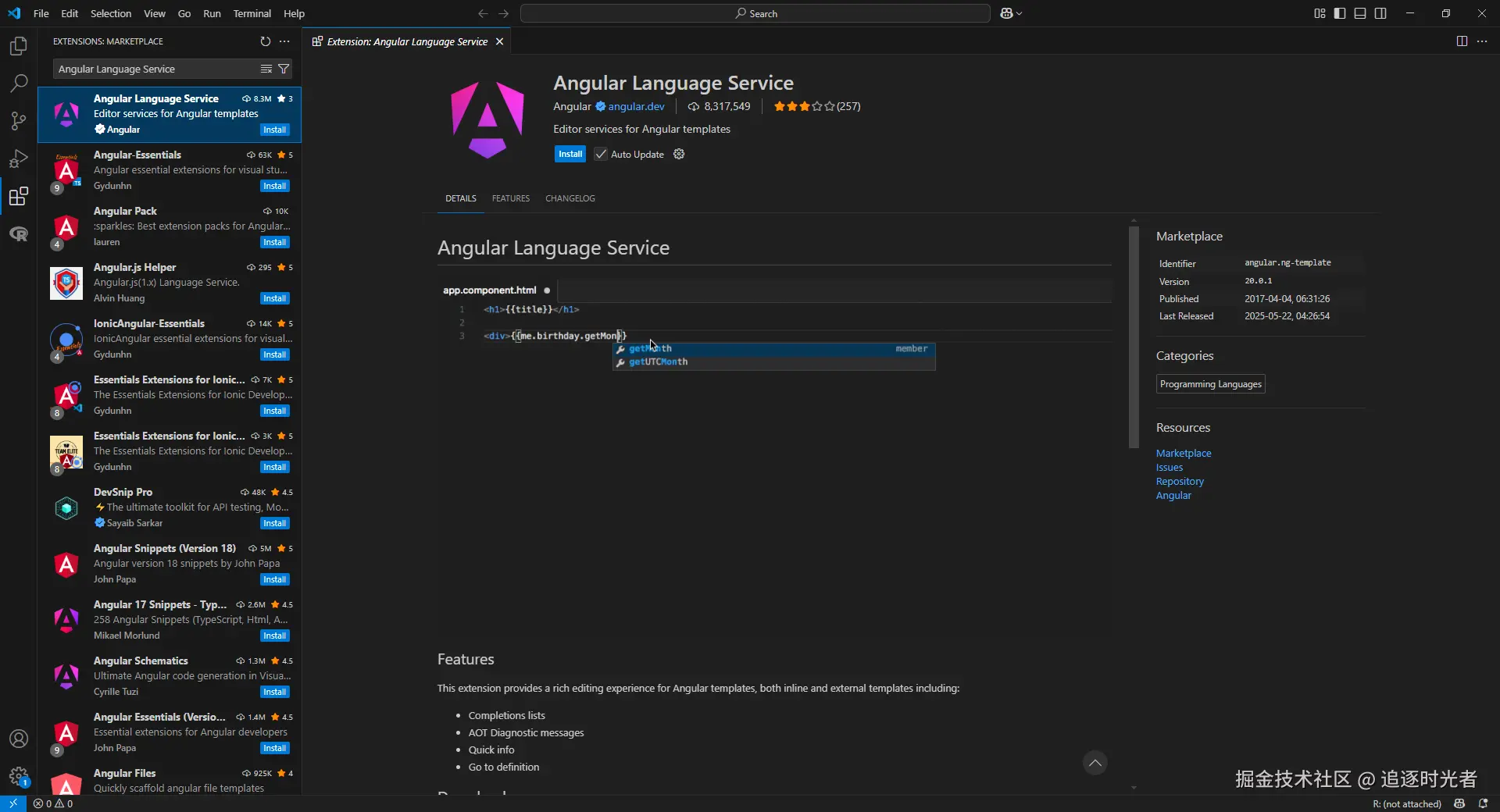 Visual Studio Code 的 Angular Language Service 扩展提供了与 Angular 项目相关的语言支持和功能,以提高开发人员在 VS Code 中的 Angular 开发体验。