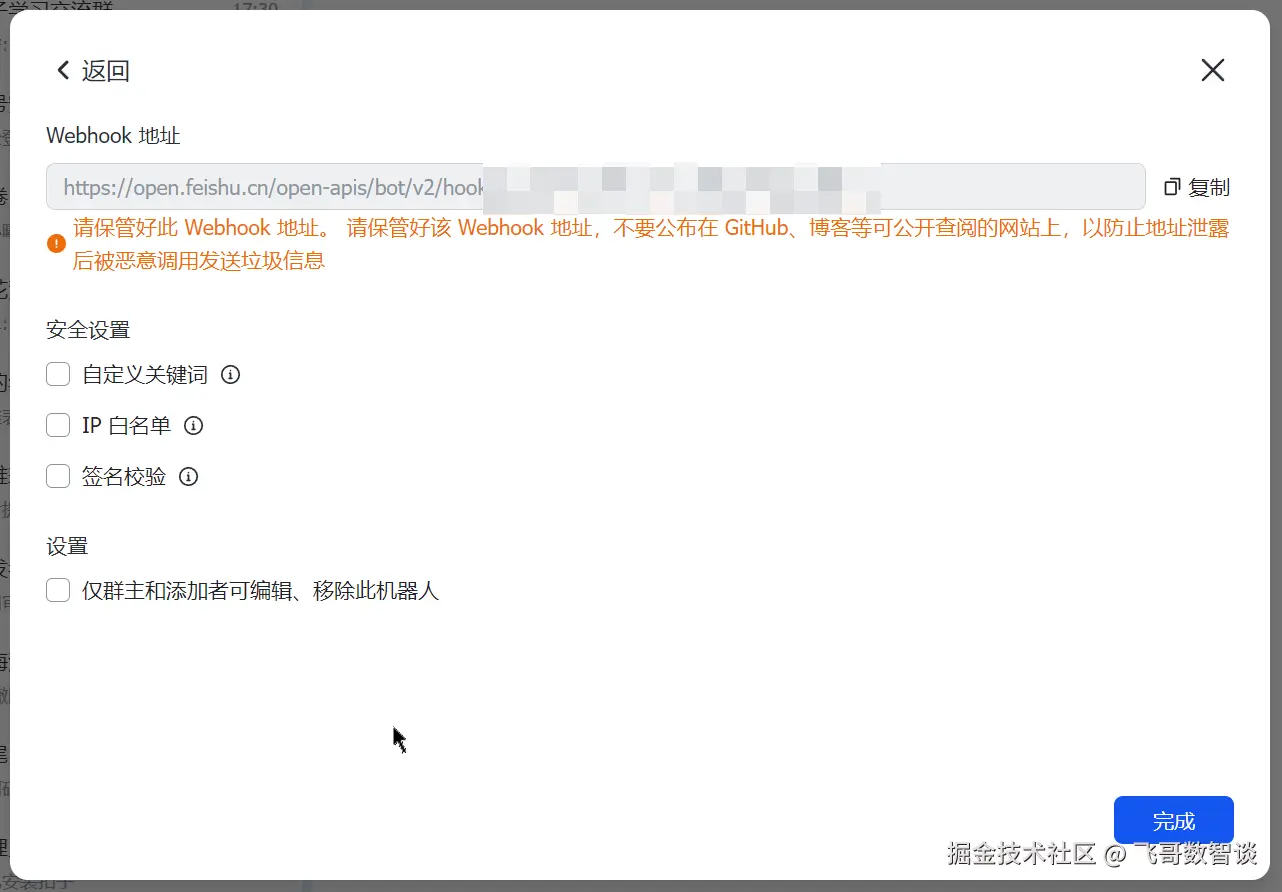 就得到了 Webhook 地址,复制下来备用,我们仅用于测试,因此安全设置未设置。