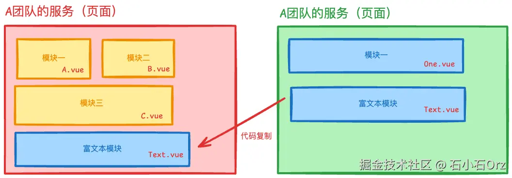 在前端项目中,不同团队之间的业务模块可能有耦合,比如A团队的页面里有一个富文本模块(组件),而B团队 的页面恰好也需要使用这个富文本模块。